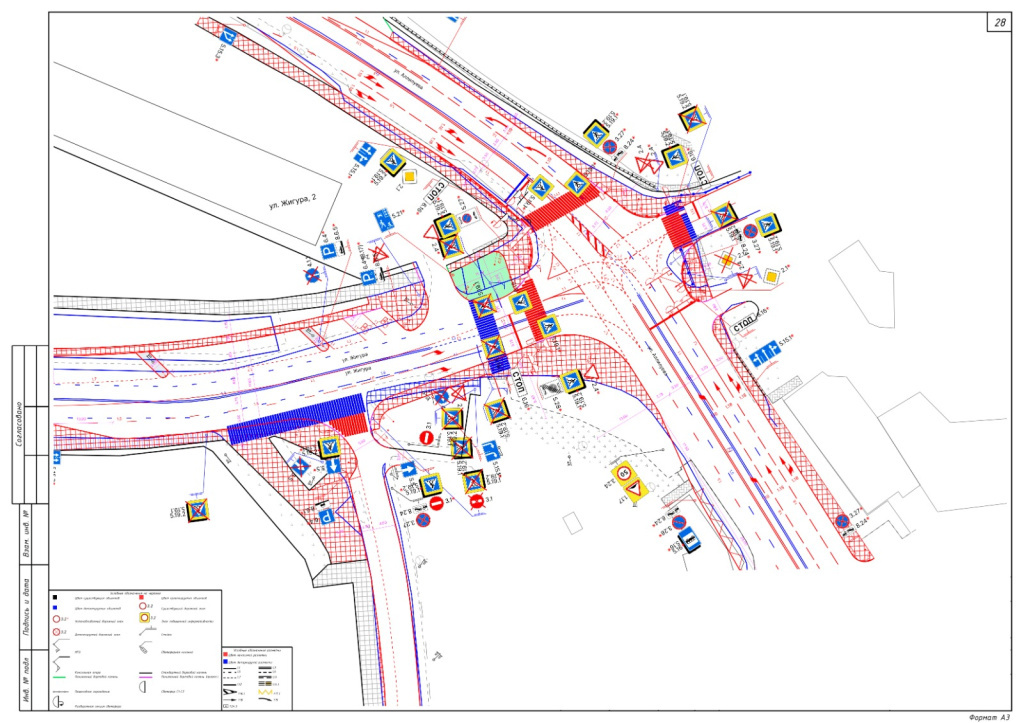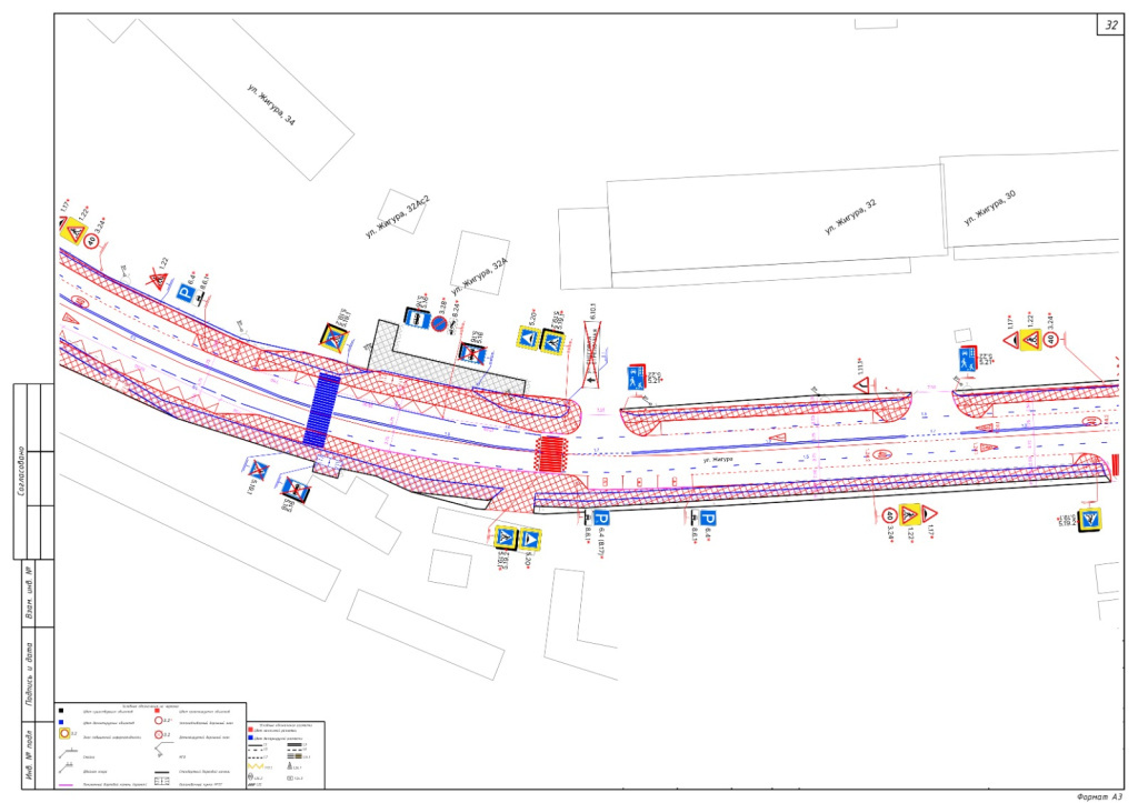 Для движения автомобилей по улице Жигура будет предусмотрено по одной полосе движения в каждом направлении шириной 3,75 м. По обеим сторонам дороги будут расположены парковочные зоны и карманы.