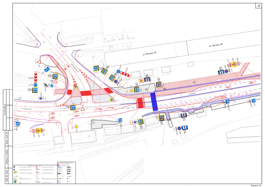 В районе перекрестка для разделения потоков транспорта с разных направлений будут обустроены два разделительных островка. Они также послужат островками безопасности для пешеходов при переходе дороги через улицу Котельникова. С стороны дома № 48 по улице Жигура будет расширен тротуар, а пешеходный переход сдвинется на несколько метров ближе к перекрестку и будет оборудован искусственной неровностью.