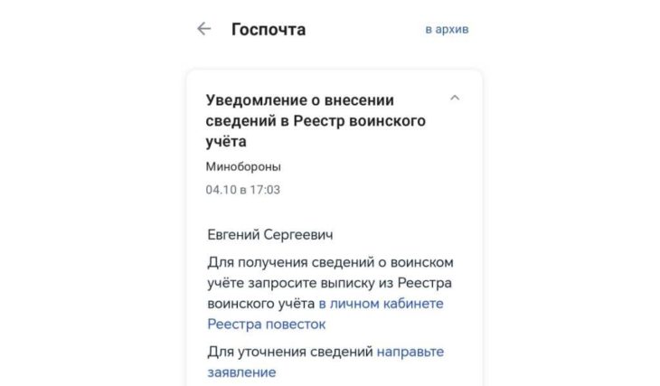 В письмах содержится информация о том, что сведения о гражданине внесены в реестр, а также инструкция по получению выписки через личный кабинет «Реестра повесток» на Госуслугах. При обнаружении неточностей в данных мужчины могут подать заявление на их исправление.