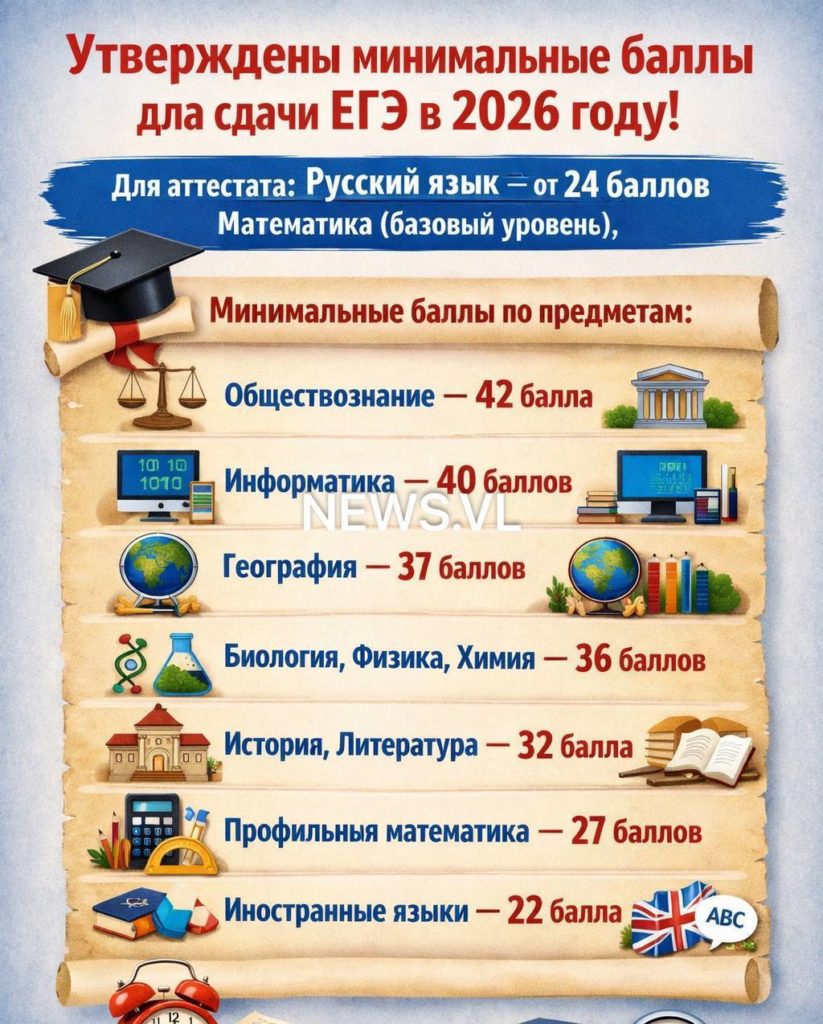 Минпросвещения России утвердило минимальные баллы ЕГЭ, необходимые для получения школьного аттестата в 2026 году. Для обязательных предметов пороги остались прежними: по русскому языку нужно набрать не менее 24 баллов, а по математике базового уровня — просто сдать экзамен, сообщает otvprim.ru