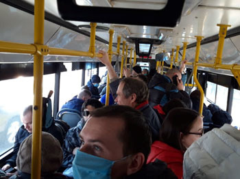 Утром автобусы переполнены настолько, что двери закрываются с трудом, а многим пассажирам приходится оставаться на остановках, ожидая следующий рейс.