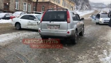 Массовое ДТП спровоцировал водитель во Владивостоке, сообщает otvprim.ru. На Капитана Шефнера водитель Мазды проигнорировал бетонные блоки установленные на спуске, на скользкой дороге не