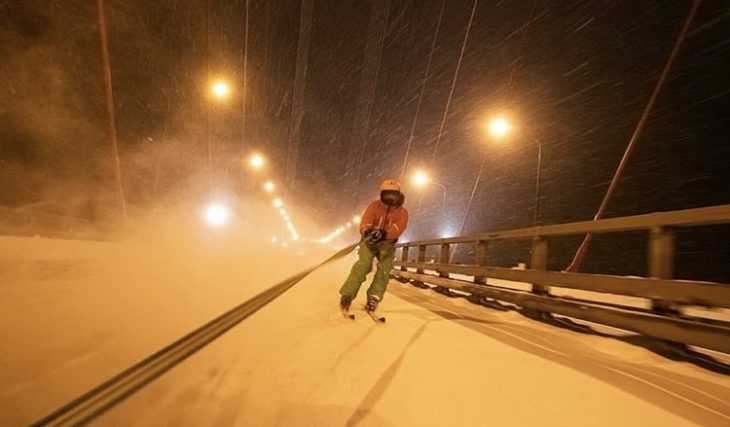 «Само собой, использовал защиту. Без нее все кончилось бы печально, так как без падений не обошлось», — отметил сноубордист, добавив, что городские дороги были хорошо почищены. Именно поэтому канты на сноуборде сильно сточились — приходилось периодически ехать по асфальту, пуская шлейф из искр.
