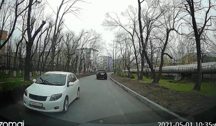 «Джигитам правила не писаны. Эти товарищи, на Тойота Аксио г/н Р449ЕН/05, промчались прямо по встречке, по ул. Бородинская между домами 19-23, в 10:35, чуть не устроивши лобовое столкновение», — комментирует ситуацию автор видео.