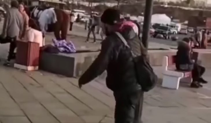 Мужчина громко кричал и совершал непонятные телодвижения. Затем ударил фонарный столб, урну и отправился восвояси.