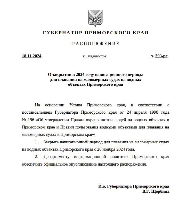 В Приморском крае закрывают навигацию для маломерных судов среди неделя, сообщает otvprim.ru