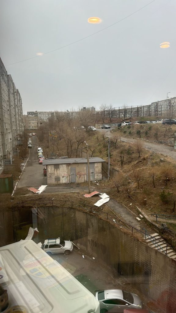 Как сообщают, подписчики телеграм канала @svodka25: «В районе остановки «Детский парк» сейчас ветром вырвало огромный кусок металлической крыши. Тот на последнем издыхании висит, намереваясь прилететь либо в машину, либо в человека.»