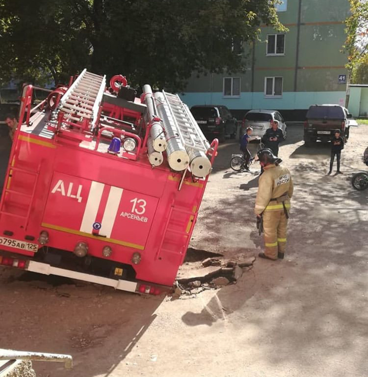 По свидетельству очевидцев, машина МЧС сдавала задним ходом и наехала на люк. Дальше произошло то, чего не ожидал никто – люк провалился в асфальт, а вместе с ним и пожарный автомобиль.