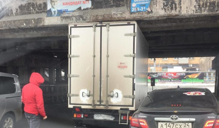 Как стало известно, водитель грузовика не сумел соотнести габариты транспортного средства и моста. Очевидцы прислали фото с места ДТП под железнодорожным мостом на пересечении улиц Воропаева и Фадеева. Другие водители испытывают некоторые сложности с проездом на данном участке дороги.