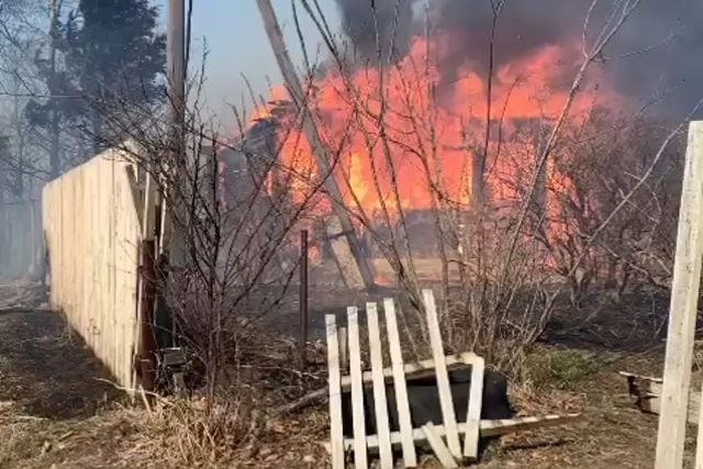 Мощный пожар бушует в посёлке Мирном в СНТ «Дорожник», сообщает otvprim.ru.